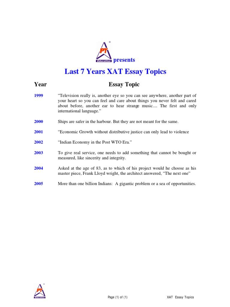 · By: R Chandrakala on October 10, XAT Essay Writing is an important section which a candidate must know to attempt well in order to do well in the examination. College Essay Writing is a section which a candidate has to do well in addition to the section on General Knowledge. General Knowledge as a section is manageable wherein a candidate would have · The Xavier Admission Test (XAT) is the most famous exam in the MBA entrance test after CAT. Last 15 Years Essay Topics for XAT will give you a glance of XAT Essay Writing Topics for Some of the famed MBA colleges make use of XAT scores to shortlist candidates for the next stage in the admissions procedure Join India's Biggest Free Mock Test for CAT - blogger.com Get more details here: blogger.com to handle XAT 20